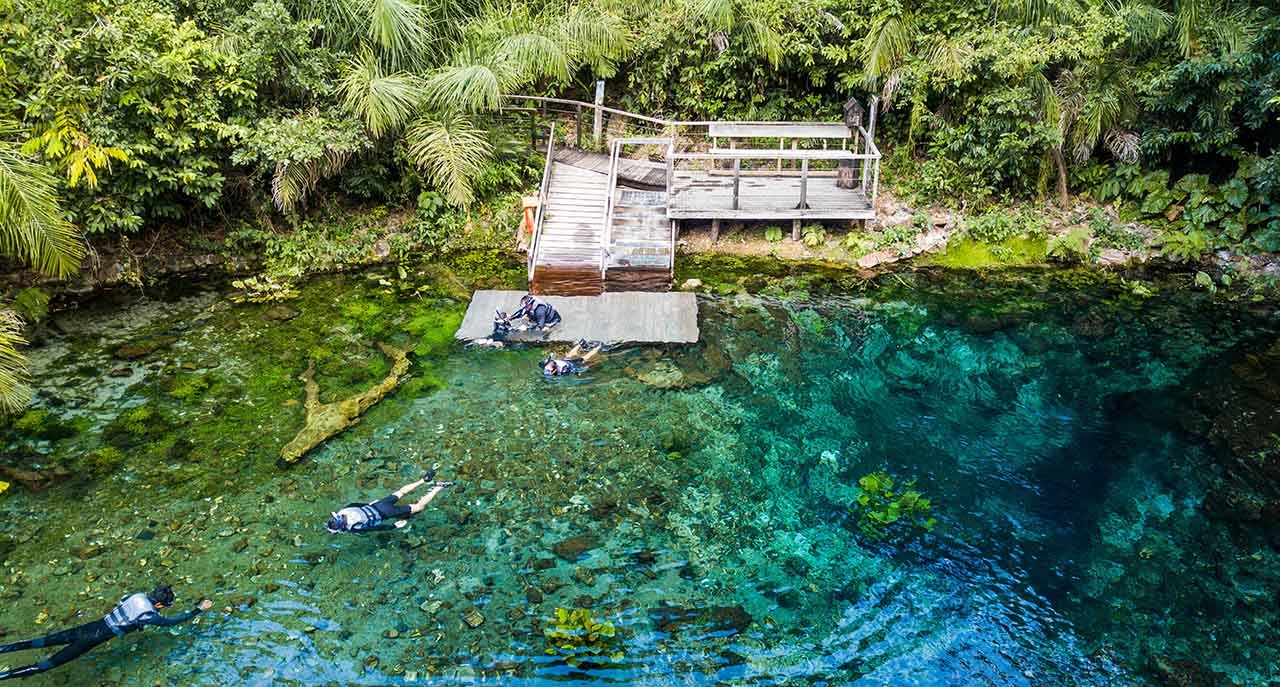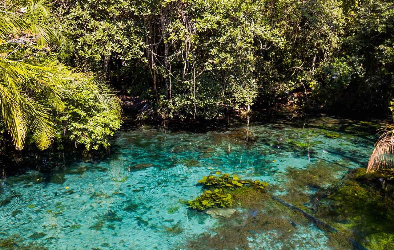 A nascente do Rio Baía Bonita, onde acontece a flutuação, leva o mesmo nome da reserva e impressiona pela transparência das águas cristalinas e pela quantidade de peixes.